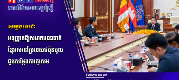 សម្តេចអគ្គមហាសេនាបតីតេជោ ហ៊ុន សែន ប្រមុខរដ្ឋស្តីទីនៃព្រះរាជាណាចក្រកម្ពុជា បានអនុញ្ញាតឱ្យក្រុមការងារសមាគមជនជាតិខ្មែររស់នៅប្រទេសជប៉ុន ដឹកនាំដោយ លោក ហៃ វណ្ណា ចូលជួបសម្តែងការគួរសម។ ជំនួបនេះធ្វើឡើង នៅវិមានសាមគ្គីភាព នៃព្រឹទ្ធសភា នាព្រឹកថ្ងៃចន្ទ ទី៦ ខែមេសា ឆ្នាំ២០២៦។ សូមទស្សនាព័ត៌មានពិស្ដារ៖