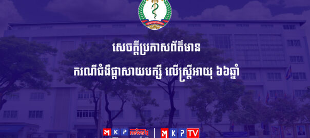ក្រសួងសុខាភិបាលនៃព្រះរាជាណាចក្រកម្ពុជា សូមជម្រាបជូនសាធារណជនឱ្យបានជ្រាបថា មានករណី ជំងឺផ្តាសាយបក្សី ចំនួន ០១ករណើរ កើតលើស្ត្រីអាយុ ៦ឆ្នាំ ដែលត្រូវបានបញ្ជាក់ថា មានវិជ្ជមានវីរុសផ្តាសាយបក្សី ប្រភេទហាស់ អ៊ុម (HENI) នៅថ្ងៃទី២១ ខែមេសា ឆ្នាំ២០២៥ ដោយវិទ្យាស្ថានជាតិសុខភាពសាធារណៈ។ សូមទស្សនាព័ត៌មានពិស្ដារ៖