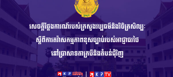 ស្របតាមលិខិតផ្លូវការ ចុះថ្ងៃទី៣០ ខែមករា ឆ្នាំ២០២៦ និងថ្ងៃទី១៣ ខែមេសា ឆ្នាំ២០២៦ ព្រមទាំងថ្ងៃទី២២ ខែមេសា ឆ្នាំ២០២៦ ក្រសួងវប្បធម៌និងវិចិត្រសិល្បៈ សូមបន្តធ្វើការតវ៉ាយ៉ាងខ្លាំងក្លាបំផុត ចំពោះវត្តមាន និងការបន្តបង្កសកម្មភាពខុសច្បាប់របស់អាជ្ញាធរថៃ នៅប្រាសាទតាក្របី និងតំបន់ជុំវិញ ដែលជាទីតាំងស្ថិតនៅក្នុងដែនអធិបតេយ្យភាពរបស់កម្ពុជា។ សូមទស្សនាព័ត៌មានពិស្ដារ៖