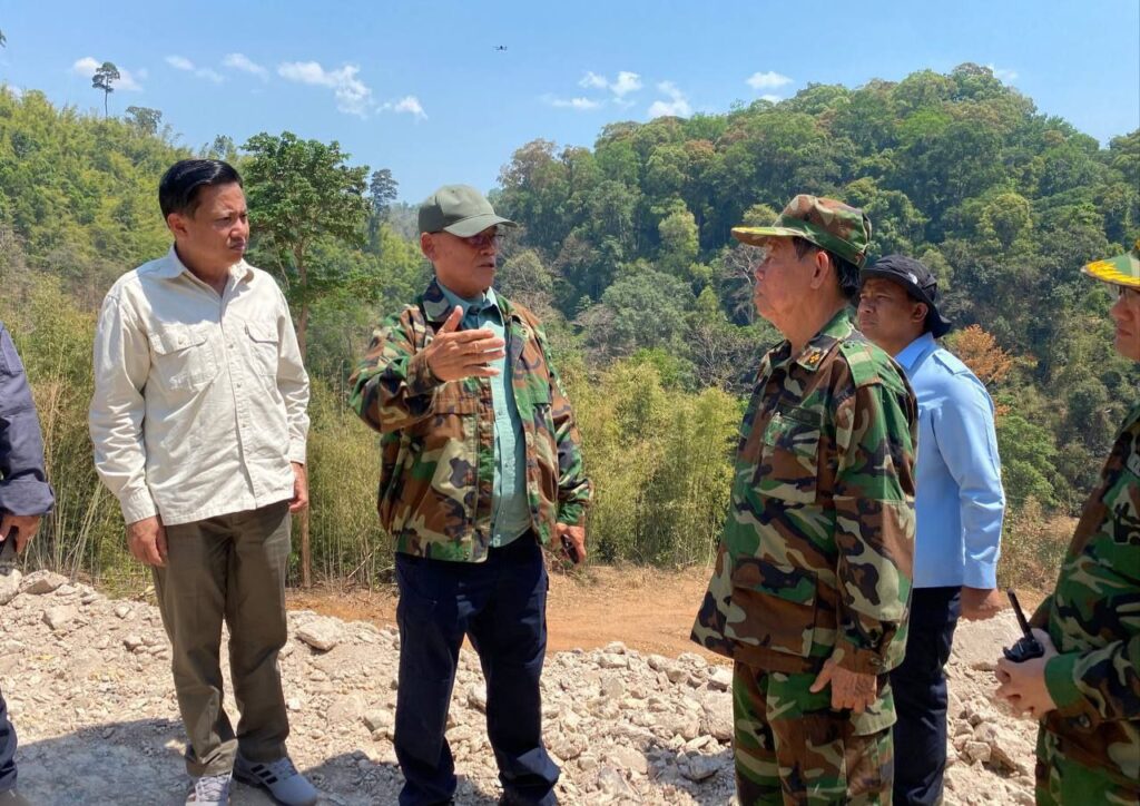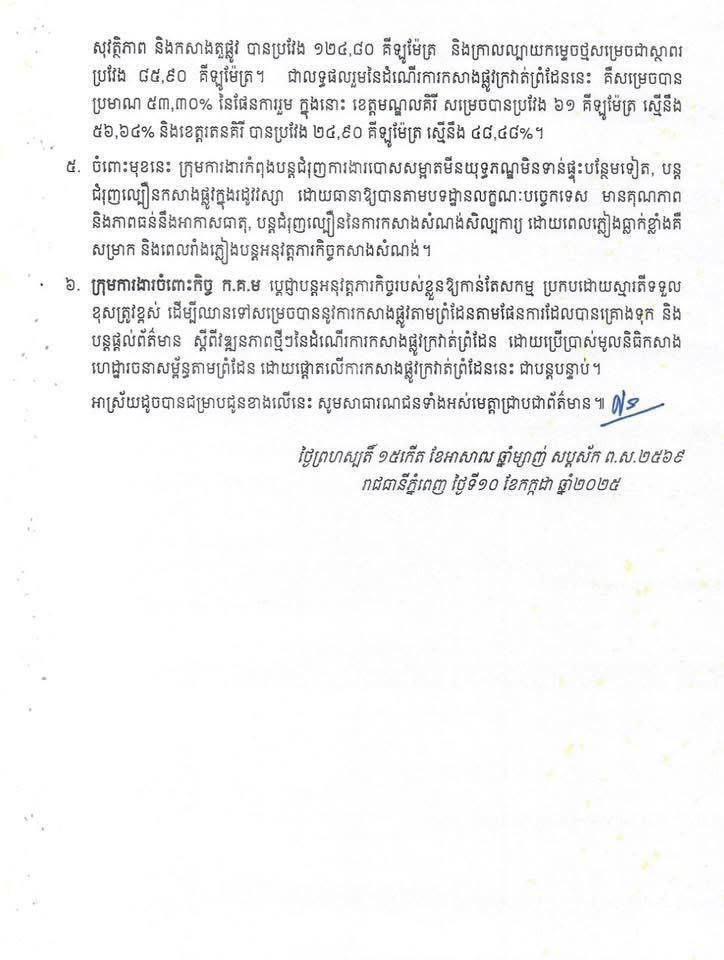 ៤. វឌ្ឍនភាពនៃដំណើរការកសាងផ្លូវព្រំដែននៅក្នុងរយៈពេលប្រមាណ ៧ ខែ កន្លងមកនេះ ក្រុមការងារចំពោះកិច្ច ក.គ.ម បានឈូសព្រៃទទឹង ៥ ម៉ែត្រ បានប្រវែង ១៧៦,៥០ គីឡូម៉ែត្រ សម្រាប់រកផ្លូវខ្សែដំបូង, ឈូសផ្លូវ ទទឹង ២០ ម៉ែត្រ បានប្រវែង ១៥១,២០ គីឡូម៉ែត្រ សម្រាប់រកអ័ក្សផ្លូវ, លុបជ្រលង-អូរ បន្ទាបចំណោតភ្នំ និងធ្វើប្រឡាយបានប្រវែង ១២៧,៨០ គីឡូម៉ែត្រ, ចិតជញ្ជាំងភ្នំ ធ្វើប្រឡាយបង្ហូរទឹកភ្លៀង កសាងនូវទំនប់សុវត្ថិភាព និងកសាងតួផ្លូវ បានប្រវែង ១២៤.៨០ គីឡូម៉ែត្រ និងក្រាលល្បាយកម្ទេចថ្មសម្រេចជាស្ថាពរ ប្រវែង ៨៥,៩០ គីឡូម៉ែត្រ។ ជាលទ្ធផលរួមនៃដំណើរការកសាងផ្លូវក្រវាត់ព្រំដែននេះ គឺសម្រេចបាន ប្រមាណ ៥៣,៣០% នៃផែនការរួម ក្នុងនោះ ខេត្តមណ្ឌលគិរី សម្រេចបានប្រវែង ៦១ គីឡូម៉ែត្រ ស្មើនឹង ៥៦,៦៤% និងខេត្តរតនគិរី បានប្រវែង ២៤,៩០ គីឡូម៉ែត្រ ស្មើនឹង ៤៨,៤៨%។