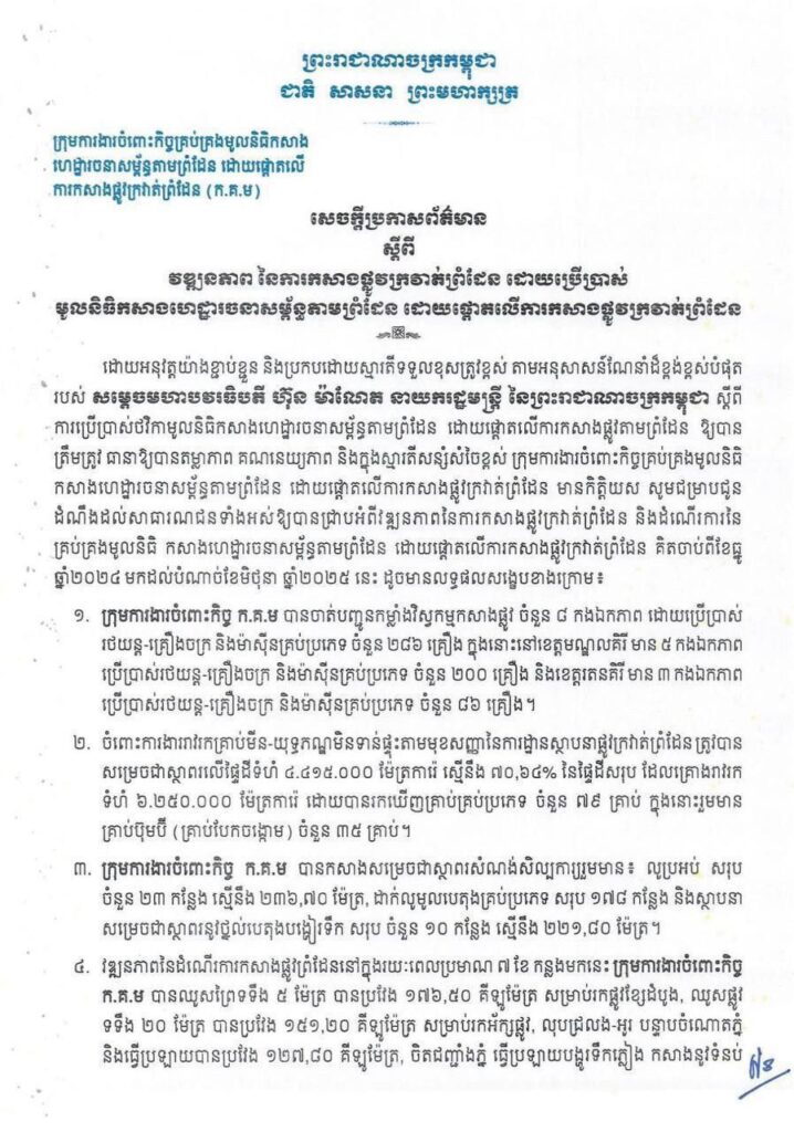 សម្តេចមហាបវរធិបតី ហ៊ុន ម៉ាណែត នាយករដ្ឋមន្ត្រី នៃព្រះរាជាណាចក្រកម្ពុជា ស្តីពី ការប្រើប្រាស់ថវិកាមូលនិធិកសាងហេដ្ឋារចនាសម្ព័ន្ធតាមព្រំដែន ដោយផ្តោតលើការកសាងផ្លូវតាមព្រំដែន ឱ្យបាន ត្រឹមត្រូវ ធានាឱ្យបានតម្លាភាព គណនេយ្យភាព និងក្នុងស្មារតីសន្សំសំចៃខ្ពស់ ក្រុមការងារចំពោះកិច្ចគ្រប់គ្រងមូលនិធិ កសាងហេដ្ឋារចនាសម្ព័ន្ធតាមព្រំដែន ដោយផ្តោតលើការកសាងផ្លូវក្រវាត់ព្រំដែន មានកិត្តិយស សូមជម្រាបជូន ដំណឹងដល់សាធារណជនទាំងអស់ឱ្យបានជ្រាបអំពីវឌ្ឍនភាពនៃការកសាងផ្លូវក្រវាត់ព្រំដែន និងដំណើរការនៃ គ្រប់គ្រងមូលនិធិ កសាងហេដ្ឋារចនាសម្ព័ន្ធតាមព្រំដែន ដោយផ្តោតលើការកសាងផ្លូវក្រវាត់ព្រំដែន គិតចាប់ពីខែធ្នូ ឆ្នាំ២០២៤ មកដល់បំណាច់ខែមិថុនា ឆ្នាំ២០២៥ នេះ ដូចមានលទ្ធផលសង្ខេបខាងក្រោម៖