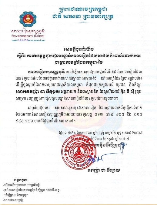 សាលារៀនសុវណ្ណភូមិ មានកិត្តិយសសូមជម្រាបជូនដំណឹងដល់សាលារៀនដែល បានទទួលរងផលប៉ះពាល់ផ្ទាល់ដោយសារជម្លោះរវាងកម្ពុជា-ថៃ នៅតាមព្រំដែនឱ្យបានជ្រាបថា៖ ដើម្បីចូលរួមចំណែកជាមួយរាជរដ្ឋាភិបាលកម្ពុជា ក៏ដូចជាក្រសួងអប់រំ យុវជន និងកីឡា លោកឧកញ៉ា ជា ធីឡាយ អគ្គនាយក និងជាស្ថាបនិក នៃស្ថាប័នអប់រំ អ៊ុន ធី ស៊ី គ្រុប សម្រេចឧបត្ថម្ភក្នុងការជួសជុលបន្ទាន់សាលារៀនដែលទទួលរងការខូចខាត។