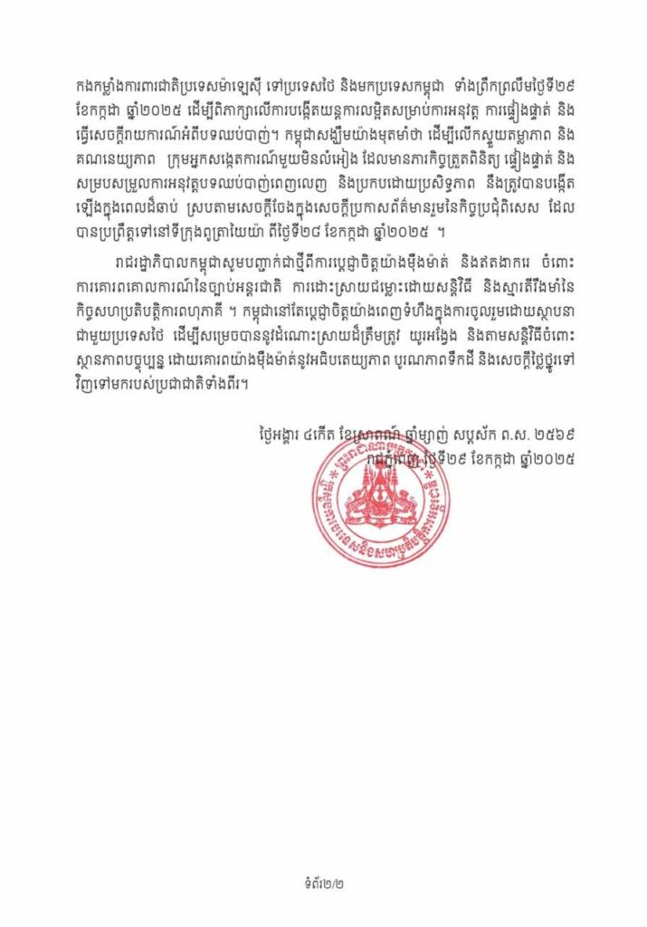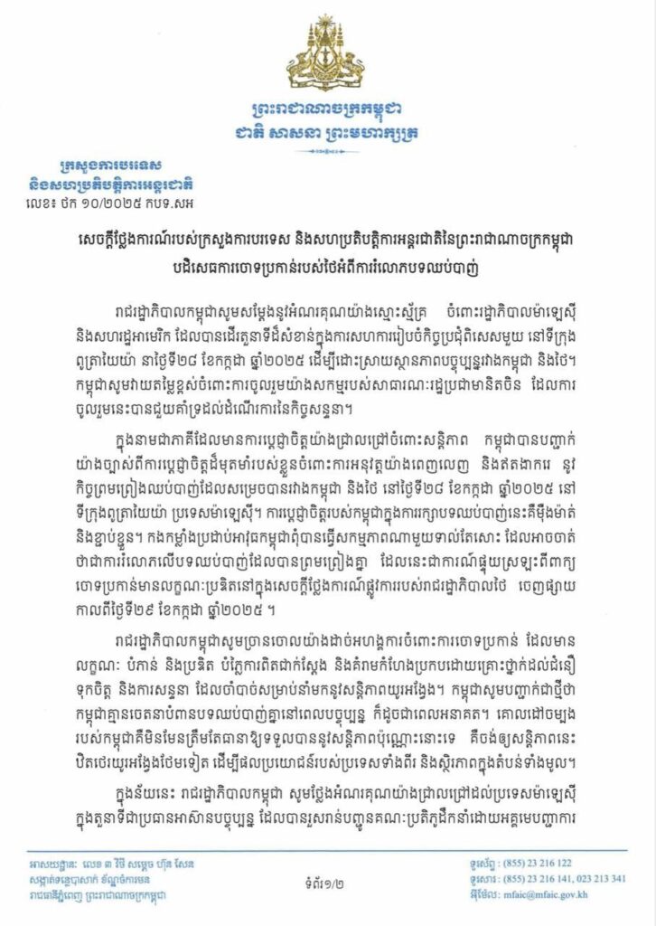 រាជរដ្ឋាភិបាលកម្ពុជាសូមសម្តែងនូវអំណរគុណយ៉ាងស្មោះស្ម័គ្រ ចំពោះរដ្ឋាភិបាលម៉ាឡេស៊ី និងសហរដ្ឋអាមេរិក ដែលបានដើរតួនាទីដ៏សំខាន់ក្នុងការសហការរៀបចំកិច្ចប្រជុំពិសេសមួយ នៅទីក្រុង ពូត្រារៃយ៉ា នាថ្ងៃទី២៨ ខែកក្កដា ឆ្នាំ២០២៥ ដើម្បីដោះស្រាយស្ថានភាពបច្ចុប្បន្នរវាងកម្ពុជា និងថៃ។ កម្ពុជាសូមវាយតម្លៃខ្ពស់ចំពោះការចូលរួមយ៉ាងសកម្មរបស់សាធារណៈរដ្ឋប្រជាមានិ ចូលរួមនេះបានជួយគាំទ្រដល់ដំណើរការនៃកិច្ចសន្ទនា។