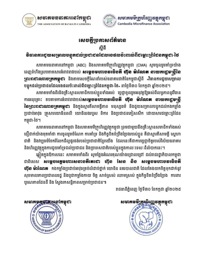 សមាគមធនាគារនៅកម្ពុជា (ABC) និងសមាគមមីក្រូហិរញ្ញវត្ថុកម្ពុជា (CMA) សូមចូលរួមគាំទ្រយ៉ាង ពេញទំហឹងស្របតាមសារអំពាវនាវរបស់ សម្តេចមហាបវរធិបតី ហ៊ុន ម៉ាណែត នាយករដ្ឋមន្ត្រីនៃ ព្រះរាជាណាចក្រកម្ពុជា និងតាមសេចក្តីណែនាំរបស់ធនាគារជាតិនៃកម្ពុជាស្តីពី «វិធានការជួយសម្រាល បន្ទុកដល់ប្រជាជនដែលរងផលប៉ះពាល់ពីជម្លោះព្រំដែនកម្ពុជា-ថៃ- នាថ្ងៃទី៣០ ខែកក្កដា ឆ្នាំ២០២៥។