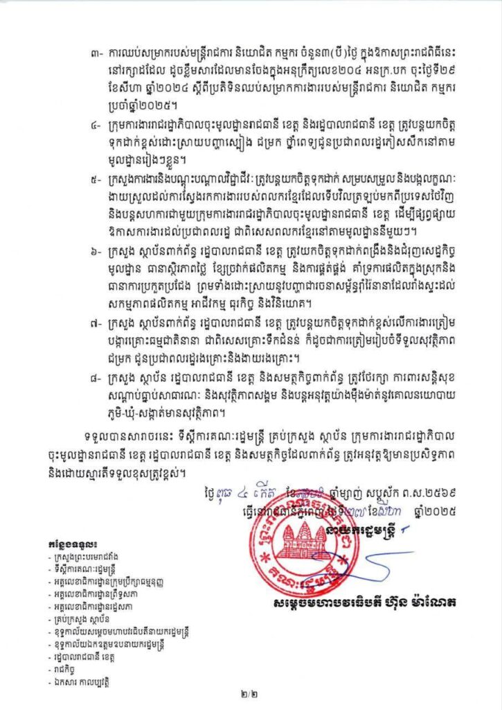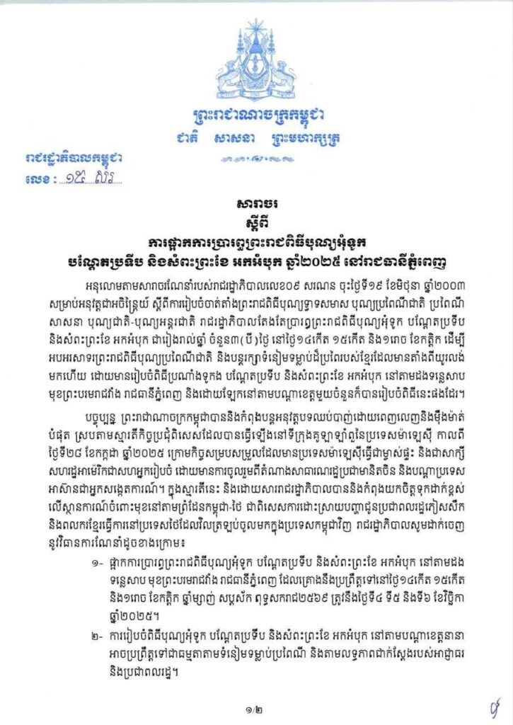 សារាចរ ស្តីពី ការផ្អាកការប្រារព្ធព្រះរាជពិធី បុណ្យអុំទូក បណ្តែតប្រទីប និងសំពះព្រះខែ អកអំបុក ឆ្នាំ២០២៥ នៅរាជធានីភ្នំពេញ