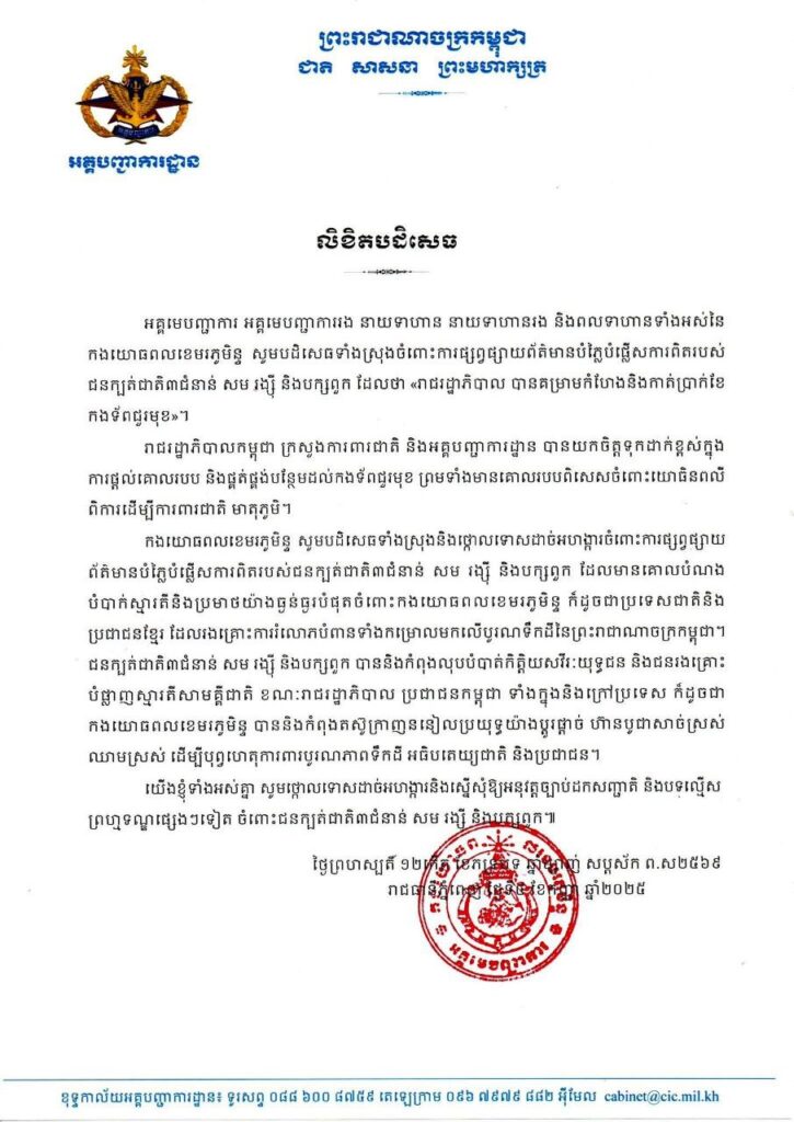 អគ្គមេបញ្ជាការ អគ្គមេបញ្ជាការរង នាយទាហាន នាយទាហាន រង និងពលទាហានទាំងអស់នៃកងយោធពលខេមរភូមិន្ទ នៅថ្ងៃទី៤ ខែកញ្ញា ឆ្នាំ២០២៥នេះ បានចេញមកបដិសេធទាំងស្រុង ចំពោះការផ្សព្វផ្សាយព័ត៌មានបំភ្លៃបំផ្លើសការពិតរបស់ ជនក្បត់ជាតិ៣ជំនាន់ សម រង្ស៉ី និងបក្ខពួក ដែលថា «រាជរដ្ឋាភិបាល បានគំរាមកំហែង និងកាត់ប្រាក់ខែកងទ័ពជួរមុខ»។