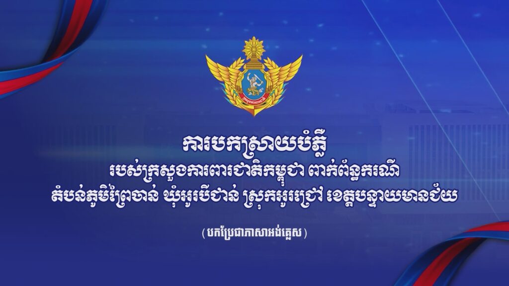 ការបកស្រាយបំភ្លឺរបស់ក្រសួងការពារជាតិកម្ពុជា ពាក់ព័ន្ធករណីតំបន់ភូមិព្រៃចាន់ ឃុំអូរបីជាន់ ស្រុកអូរជ្រៅ ខេត្តបន្ទាយមានជ័យ (បកប្រែជាភាសាអង់គ្លេស)៖