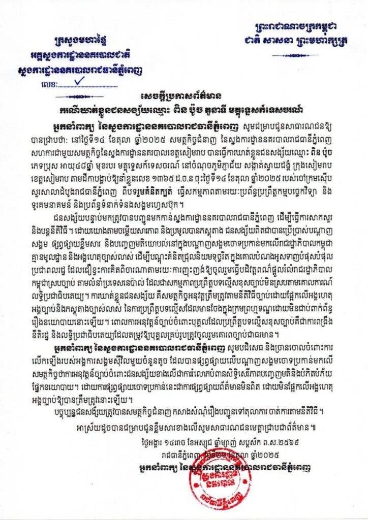អ្នកនាំពាក្យស្នងការដ្ឋាន នគរបាលរាជធានីភ្នំពេញ បញ្ជាក់ថា ការឃាត់ខ្លួនមគ្គុទ្ទេសក៍ទេសចរណ៍មួយរូប គឺអនុវត្តត្រឹមត្រូវតាមនិតីវិធីច្បាប់ ដោយមិនជាប់ពាក់ព័ន្ធរឿងនយោបាយនោះទេ។