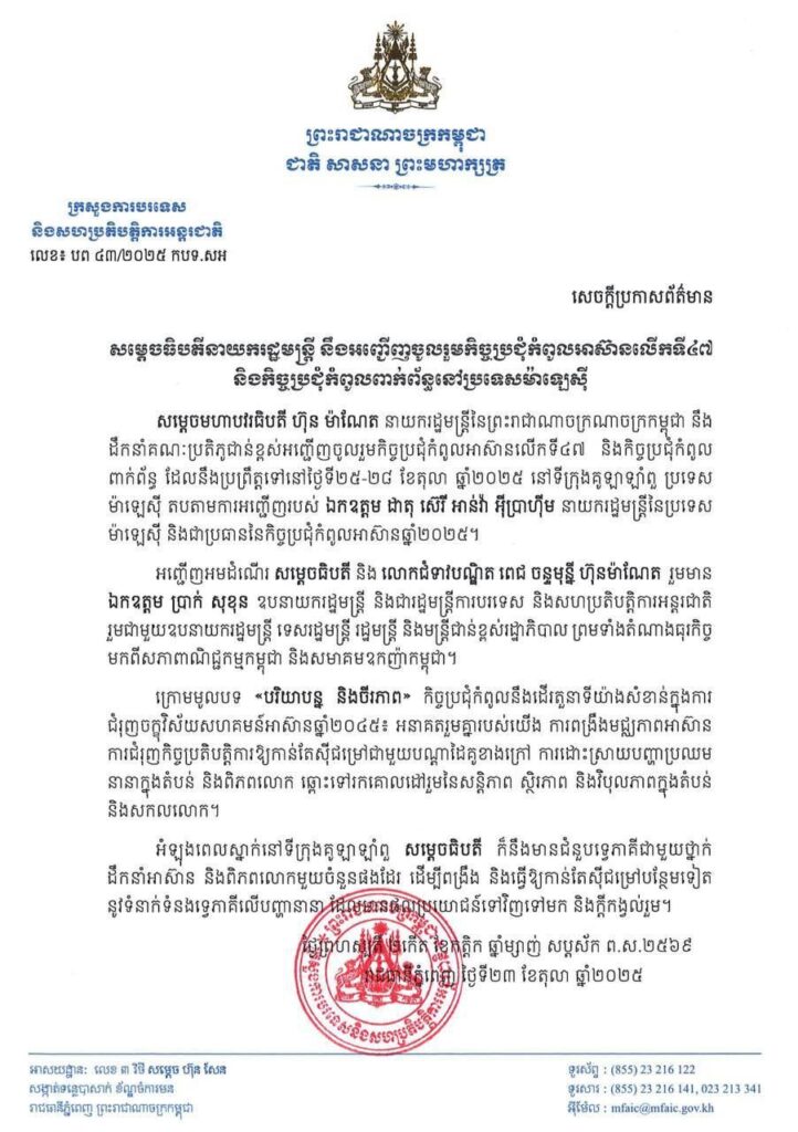សម្តេចមហាបវរធិបតី ហ៊ុន ម៉ាណែត នាយករដ្ឋមន្ត្រីនៃព្រះរាជាណាចក្រណាចក្រកម្ពុជា នឹង ដឹកនាំគណៈប្រតិភូជាន់ខ្ពស់អញ្ជើញចូលរួមកិច្ចប្រជុំកំពូលអាស៊ានលើកទី៤៧ និងកិច្ចប្រជុំកំពូល ពាក់ព័ន្ធ ដែលនឹងប្រព្រឹត្តទៅនៅថ្ងៃទី២៥-២៨ ខែតុលា ឆ្នាំ២០២៥ នៅទីក្រុងគូឡាឡាំពួ ប្រទេស ម៉ាឡេស៊ី តបតាមការអញ្ជើញរបស់ ឯកឧត្តម ដាតុ ស៊េរី អាន់វ៉ា អ៊ីប្រាហ៊ីម នាយករដ្ឋមន្ត្រីនៃប្រទេស ម៉ាឡេស៊ី និងជាប្រធាននៃកិច្ចប្រជុំកំពូលអាស៊ានឆ្នាំ២០២៥។